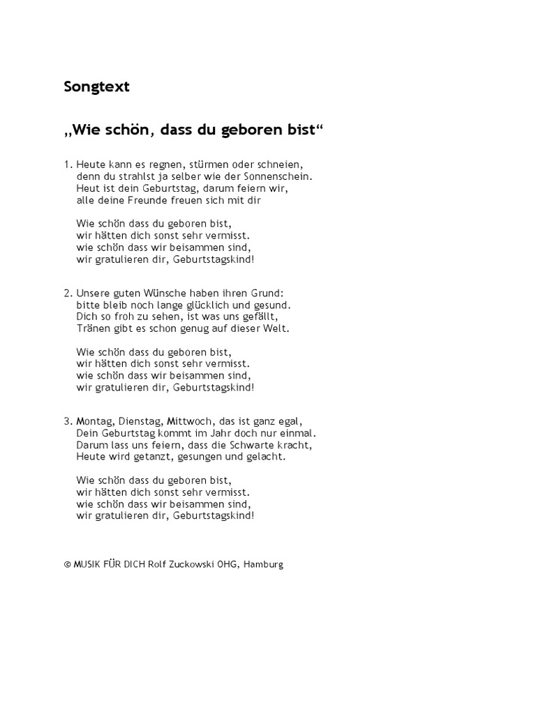 Wie Schon Dass Du Geboren Bist English Lyrics from imgv2-2-f.scribdassets.com Heut ist dein geburtstag, darum feiern wir, alle deine freunde freuen sich mit dir wie schön dass du geboren bist, wir hätten dich sonst sehr vermisst. More images for liedtext heute kann es regnen » Today is your birthday, that's why we're celebrating.
