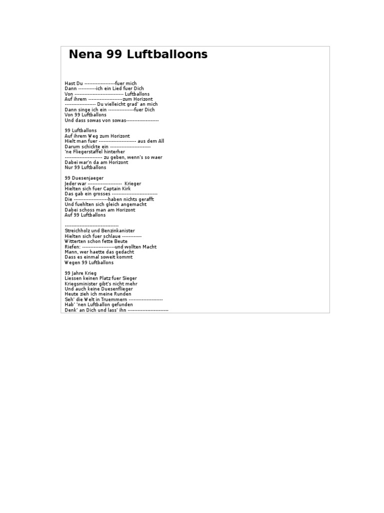 Liedtext 99 Luftballons. Dann singe ich ein lied für dich. Neunundneunzig luftballons auf ihrem weg zum horizont hielt man für ufos aus dem all darum schickte ein general 'ne fliegerstaffel hinterher.