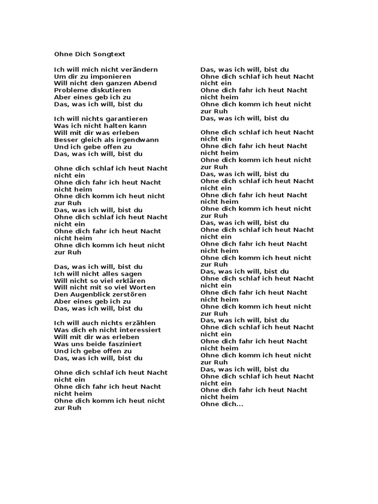 Liedtext Ohne Dich. Ich werde in die tannen gehen dahin wo ich sie zuletzt gesehen doch der abend wirft ein tuch aufs land und auf die wege hinterm waldesrand und der wald er. We do not have any tags for ohne dich (english) lyrics.